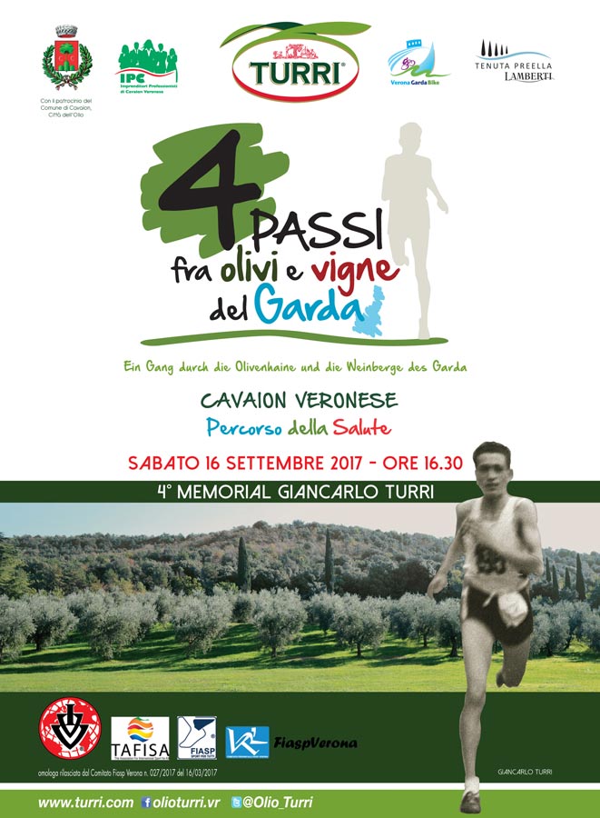Una gara podistica non competitiva tra gli olivi e le vigne delle colline del Garda. A Cavaion Veronese (Verona) sabato 16 settembre 2017 torna “4 passi tra gli olivi e le vigne del Garda”, la quarta edizione della manifestazione sportiva organizzata dal Frantoio dei Fratelli Turri, in collaborazione con Fiasp e Verona Garda Bike, con il patrocinio del comune di Cavaion Veronese.